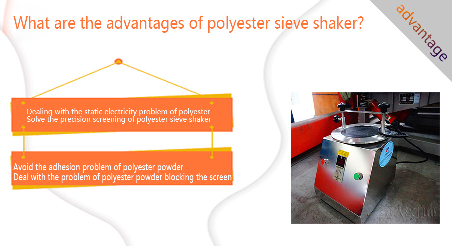 Polyester sieve shaker uses a screen made of polyester mesh, which has multiple advantages over screening machines using traditional metal mesh screens in specific applications and can handle static electricity problems, screening accuracy problems, adhesion and mesh blocking problems of polyester powder.